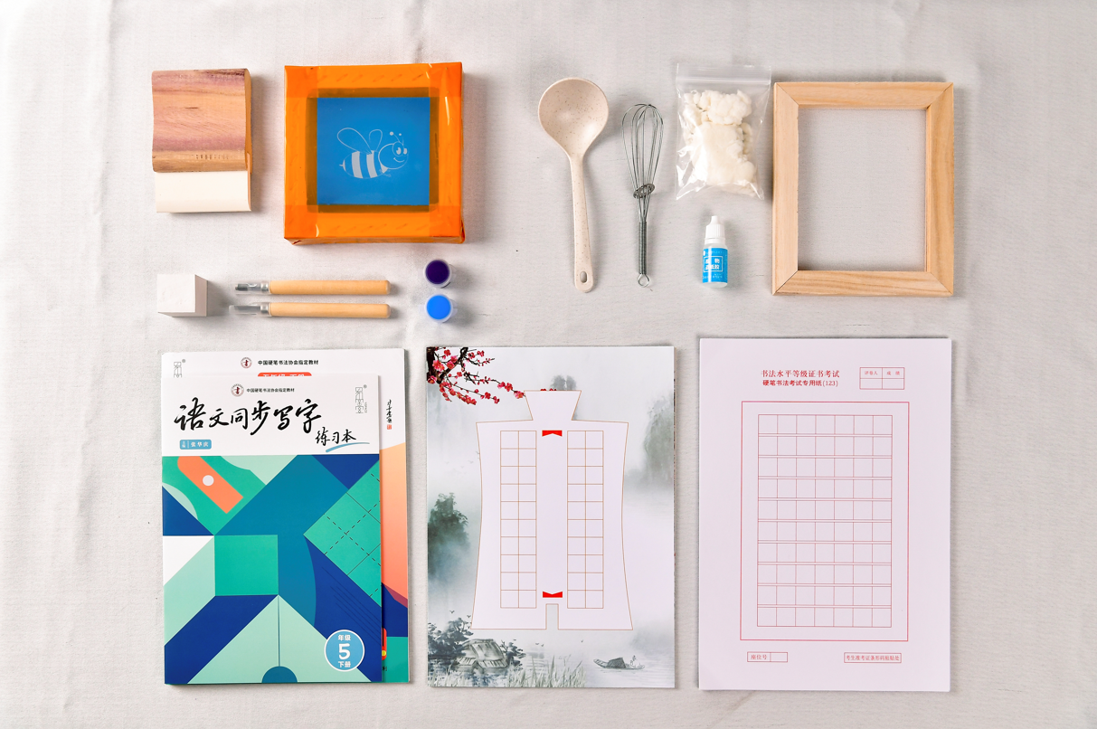 课程以正统硬笔书法课程为主线,结合造纸、篆刻、活字印刷三大非遗文化课程,通过书法与非遗的融合,提高广大青少年的综合能力,养成良好的艺术素养,弘扬中华优秀传统文化。让学生在练字的同时,体会传统文化的魅力。 材料包包含:硬笔书法创作纸、历年硬笔书法考级训练本、中国硬笔同步教材、中国硬笔同步练习册、篆刻材料包、宣纸制作材料包、丝网印刷材料包。